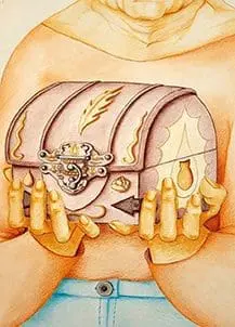 Elle disparaît un instant dans sa chambre et revient avec un magnifique coffret de bois sculpté.