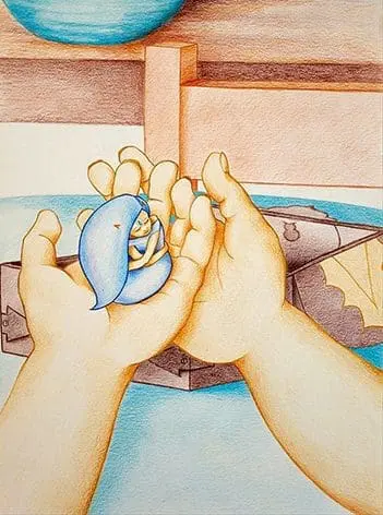 Au premier regard, elle ne voit à l’intérieur, qu’un petit œuf bleuté. Mais cette substance nacrée semble posséder de petites mains, bientôt des bras. Elle s’éveille entre les doigts de la fillette…