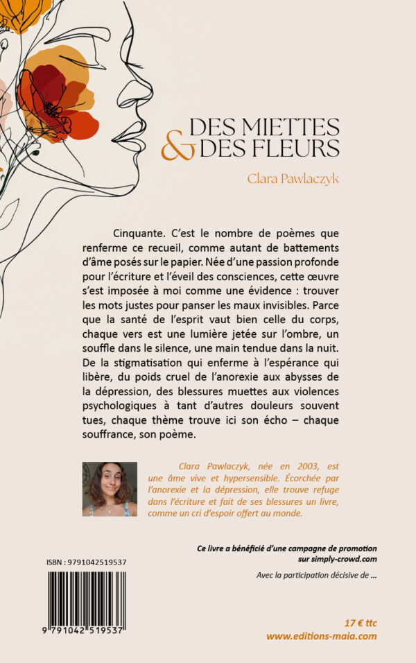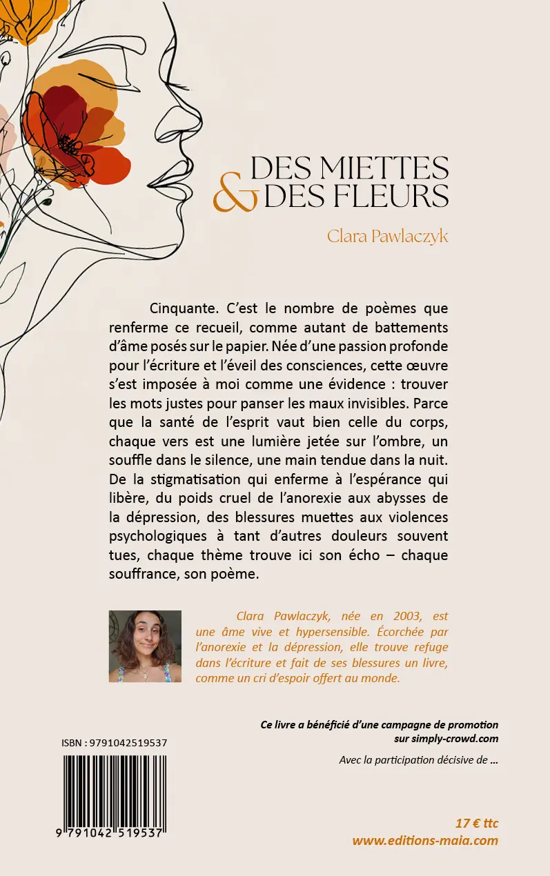 Des miettes & des fleurs est un recueil de 50 poèmes dédiés à la santé mentale, ces tempêtes silencieuses qui bouleversent sans toujours se voir. Chaque poème aborde un thème précis : troubles alimentaires, anxiété, violences, dépression, dissociation, mais aussi résilience, amitié et espoir. Ce projet est né d’un désir profond : briser les tabous, poser des mots sur l’inexprimable, et offrir à d’autres un écho, un refuge ou simplement une main tendue. Il n’y a pas de hiérarchie dans les douleurs : tous les poèmes sont un fragment d’âme, une tentative de comprendre, de guérir, de vivre. C’est aussi un hommage à celles et ceux qui, dans l’ombre, avancent malgré tout. Ce recueil, je l’ai écrit avec mes maux et mon cœur ; En espérant qu’il parle aussi un peu du vôtre.
