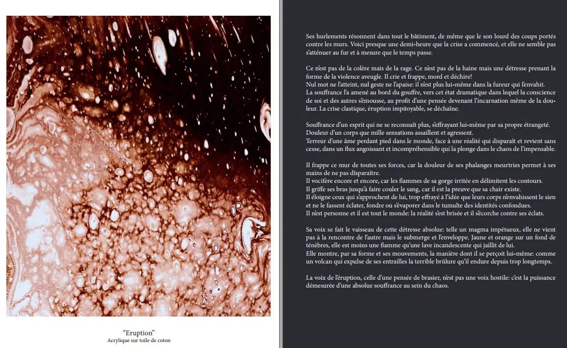Il raconte, à sa manière, la souffrance humaine qui envahit l’esprit lorsque la raison s’égare. Il le fait non pas en donnant voix aux sentiments, mais en montrant la voix elle-même lorsque ces derniers la traversent et la métamorphosent. En alliant la peinture et la poésie, il montre comment la voix de la manie, flamboyante, voit ses courants devenir tumultueux sous l’ample marée d’une euphorie irradiante. Il présente aussi la puissante éruption de la violence née de la détresse, tout comme l’abysse, sombre et lugubre, de la dépression…