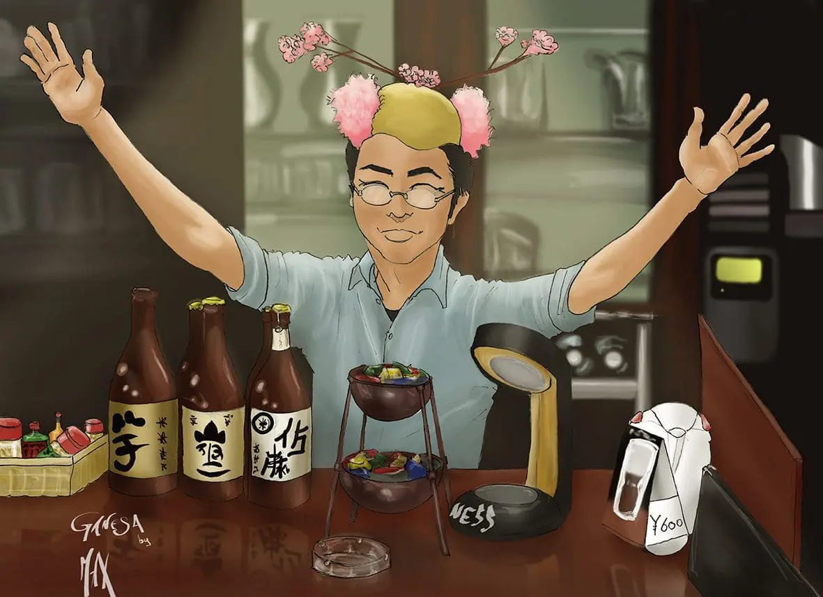 Deux jeunes femmes et un « salaryman » assis au comptoir discutent en mangeant. L’une des femmes ouvre une boîte de chocolats et en offre à tout le monde, peut-être a-t-elle quelque chose à fêter ? Je ne suis pas oublié, bon prétexte pour faire connaissance, je me présente tout en la remerciant, elle se prénomme Mirai.