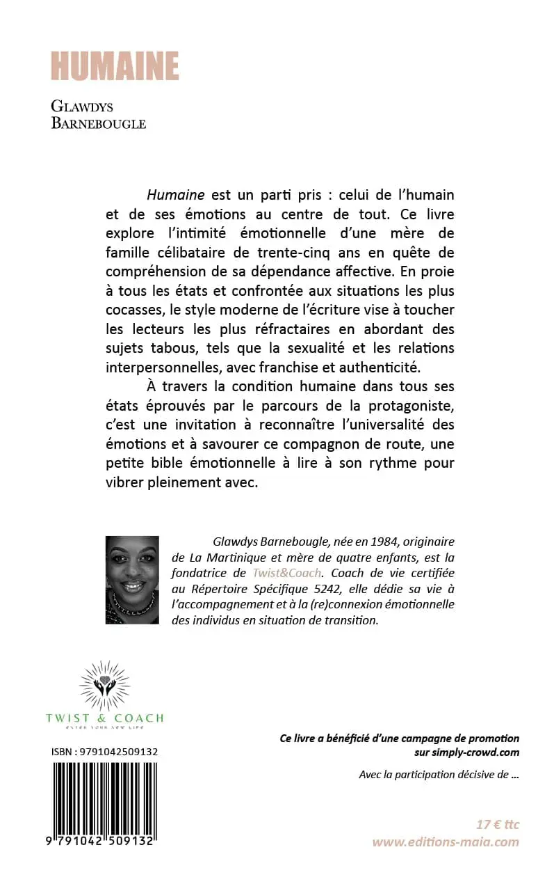 Je suis aussi l’auteure du recueil « Humaine », un parti pris : celui de l’humain et de ses émotions au centre de tout. Le livre explore l’intimité émotionnelle d’une mère de famille de 35 ans, en quête de compréhension de sa dépendance affective, en proie à une multitude d’émotions au travers de différents styles d’écriture.
