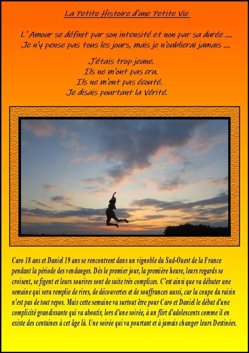 C’est l’histoire de deux adolescents. Caro 18 ans et Daniel 19 ans qui se rencontrent pendant la période des vendanges dans un vignoble du Sud-Ouest de la France. Dès le premier jour, la première heure leurs regards se croisent et leurs sourires sont de suite très complices. C’est le temps de la Jeunesse, de son insouciance, de sa naïveté et de sa vérité aussi. Cette histoire basée sur des faits réels retrace une semaine remplie de rires et de complicité entre Caro et Daniel, mais aussi la dure réalité de la vie quand elle a décidé de vous imposer ses choix et sa brutalité.