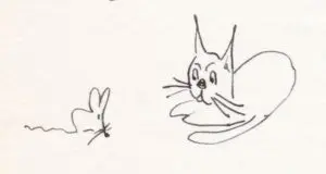 « Soudain un chat d’une toute autre espèce se dresse devant moi. Il a le corps géant d’un Maine coon bien reconnaissable à sa taille et à son museau carré, mais pour le reste des membres d’une agilité étonnante dont il joue même à l’arrêt un peu comme une danseuse à la barre des exercices, des oreilles à plumets tirant vers le panache et une faconde intarissable. Il miaule d’un roulement de gorge assez bas mais avec l’accent anglais. Il se présente :
