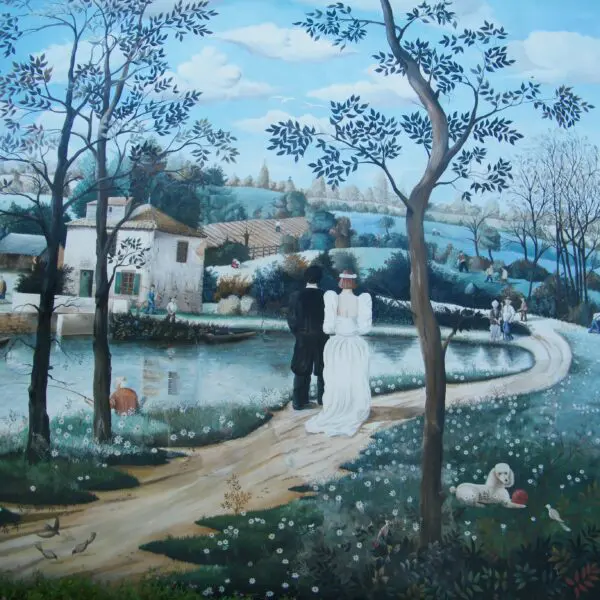 Attablée devant ma tasse vide, le temps s’écoule doucement. Il fait doux, c’est idéal pour prendre le temps de m’imprégner de ces nouveaux lieux. Mon regard est attiré par une immense fresque murale qui représente une scène champêtre sur le mur de la mairie, de l’autre côté de la rue. En l’observant plus attentivement, je m’aperçois que le personnage principal est une femme toute de blanc vêtue. Un mariage. Scène heureuse, qui évoque en moi un sentiment de vide et m’incite à changer de place pour ne plus l’avoir dans mon champ de vision. Je fais maintenant face au café. Nous sommes en milieu d’après-midi et il n’y a pas grand monde dehors, ni à l’intérieur. De ma place, j’aperçois juste un vieux monsieur qui lit le journal, accoudé au comptoir et un couple qui semble refaire le monde avec le cafetier. Seules quatre tables équipées de parasols sont installées sur la grande terrasse. Mais c’est bien suffisant compte tenu de l’affluence.