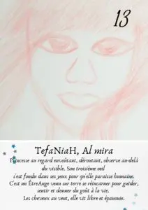 Vous invite à regarder plus en profondeur et plus loin ce qui se passe autour de vous, à distinguer le vrai du faux pour que tout devienne révélateur. Les yeux sont grands pour mieux voir, le nez parfait pour mieux sentir et la bouche aux lèvres sensuelles et charnues pour laisser l’autre s’exprimer et dévoiler la vérité. Elle vous pousse à aller plus loin dans votre réflexion, à ne pas faire de conclusion hâtive, à poser des questions et à faire preuve de discernement quant aux réponses que vous recevez à vos interrogations ; percevez, humez en inspirant la situation. Faites confiance à vos ressentis, à vos intuitions.