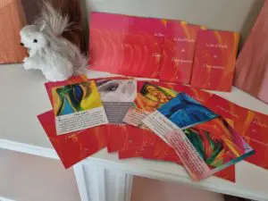 Pour aller plus loin, j’ai imaginé et créé le jeu de cartes. J’ai imprimé les 46 arcanes et expérimenté mon oracle auprès de ma clientèle. Les toiles, les couleurs, les chiffres… résonnaient comme une évidence dans leur existence. Les illustrations leur délivraient des pensées pour éclaircir leur chemin de vie. J’ai eu envie de le partager et le proposer à d’autres êtres de lumière qui sont eux aussi dans l’éveil ou qui souhaitent s’en rapprocher.