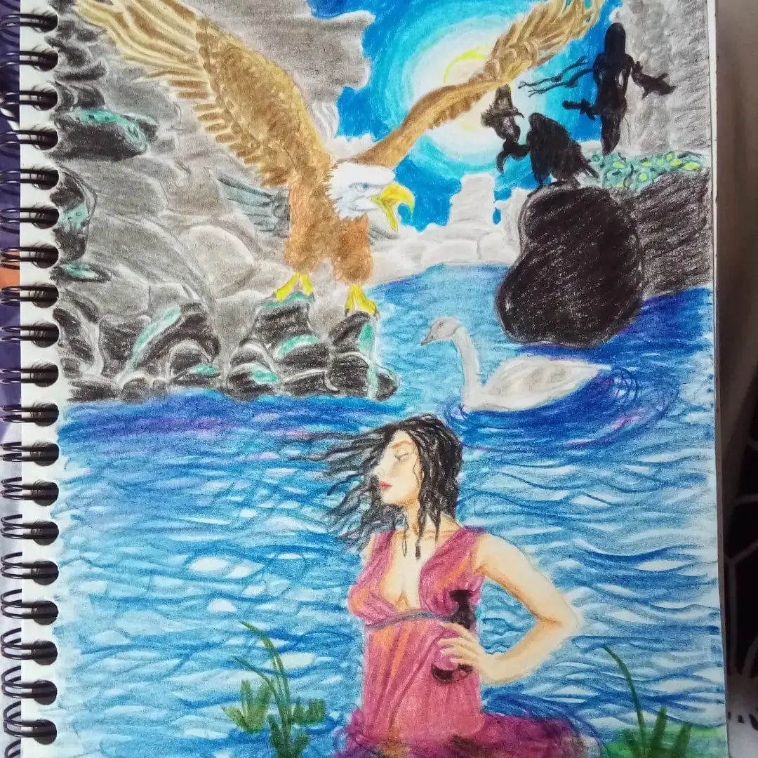 comme les autres couloirs. Ils prirent ensuite un escalier. Ils arrivèrent en bas et Avrid avait allumé sept chandeliers qui éclairaient la salle entière car ils étaient aussi grands qu’un homme et larges comme deux. Avrid leur disait que les fresques sur les murs interprétaient l’histoire de Tiliah. Il y avait des figurines sur une table en pierre. Il y avait un tigre et un lion, puis deux cygnes au milieu d’eux, un était noir. Il y avait comme un espace à droite, comme si avant il y avait quelque chose. Au-dessus de tout il y avait un aigle d’une taille énorme si bien que ses ailes étaient plus grandes que la largeur de la table et quand il vit l’aigle il vit aussi la flamme et la branche sortant derrière le cygne blanc. Avrid prit un livre qui était posé sur le dos du cygne blanc. La couverture du livre était faite de plumes blanches si bien que posé sur la figurine on ne pouvait le distinguer.