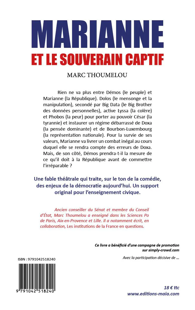 Rien ne va plus entre Démos (le peuple) et Marianne (la République). Dolos (le mensonge et la manipulation), secondé par Big Data (le Big Brother des données personnelles), active Lyssa (la colère) et Phobos (la peur) pour porter au pouvoir César (la tyrannie) et instaurer un régime débarrassé de Doxa (la pensée dominante) et de Bourbon-Luxembourg (la représentation nationale). Pour la survie de ses valeurs, Marianne va livrer un combat inégal au cours duquel elle se rendra compte des erreurs de Doxa. Mais, de son côté, Démos prendra-t-il la mesure de ce qu’il doit à la République avant de commettre l’irréparable ?