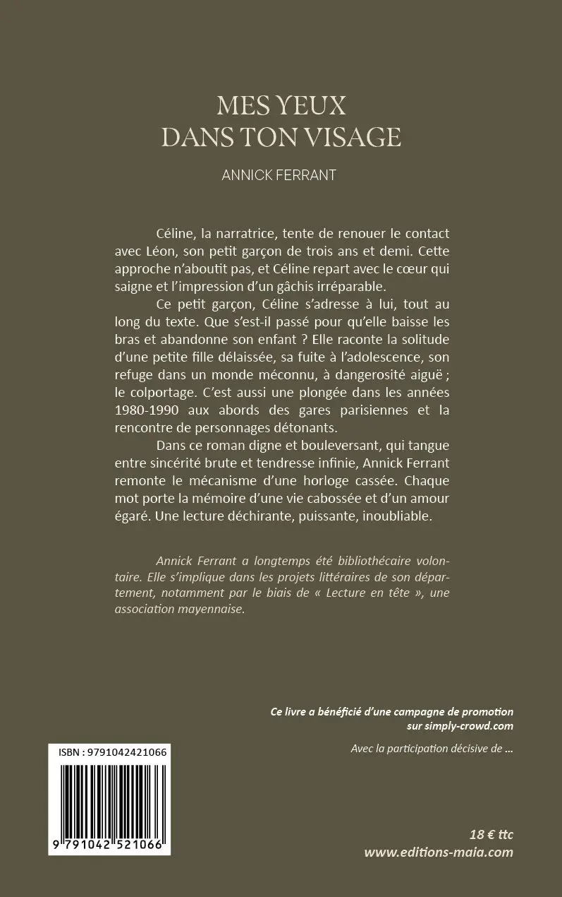 « Je vous propose d’être acteur de la naissance de mon livre en m’aidant à faire de sa parution prochaine, avec les Editions Maïa, un succès. Plus les préventes seront nombreuses, plus mon livre sera promu et diffusé. En retour, vous serez présents dans le livre en page de remerciements et vous recevrez le livre en avant-première, frais de port inclus ! »