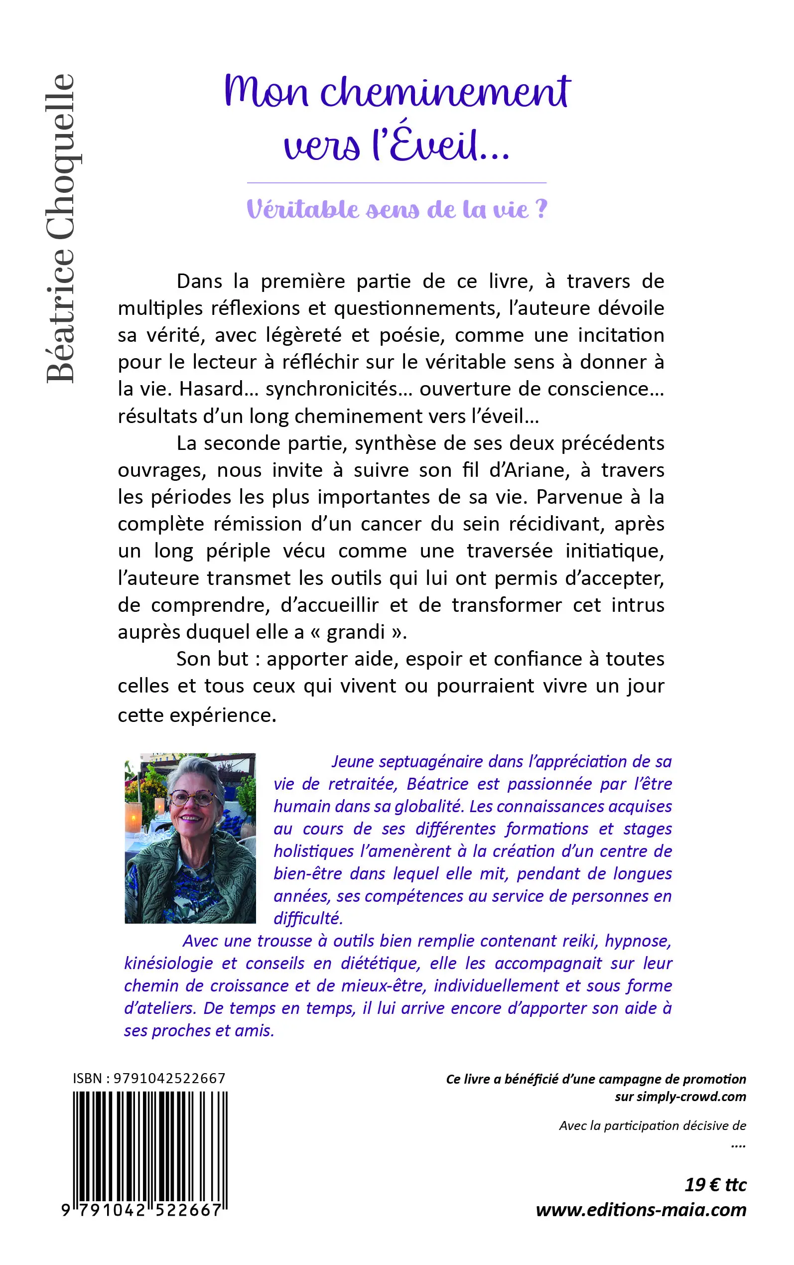 « Je vous propose d’être acteur de la naissance de mon livre en m’aidant à faire de sa parution prochaine, avec les Editions Maïa, un succès. Plus les préventes seront nombreuses, plus mon livre sera promu et diffusé. En retour, vous serez présents dans le livre en page de remerciements et vous recevrez le livre en avant-première, frais de port inclus ! »