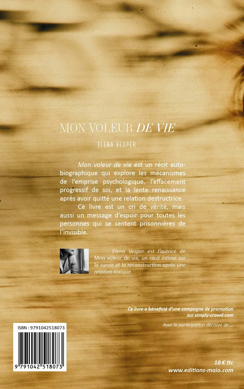 Mon voleur de vie est un récit autobiographique qui explore les mécanismes de l’emprise psychologique, l’effacement progressif de soi, et la lente renaissance après avoir quitté une relation destructrice.