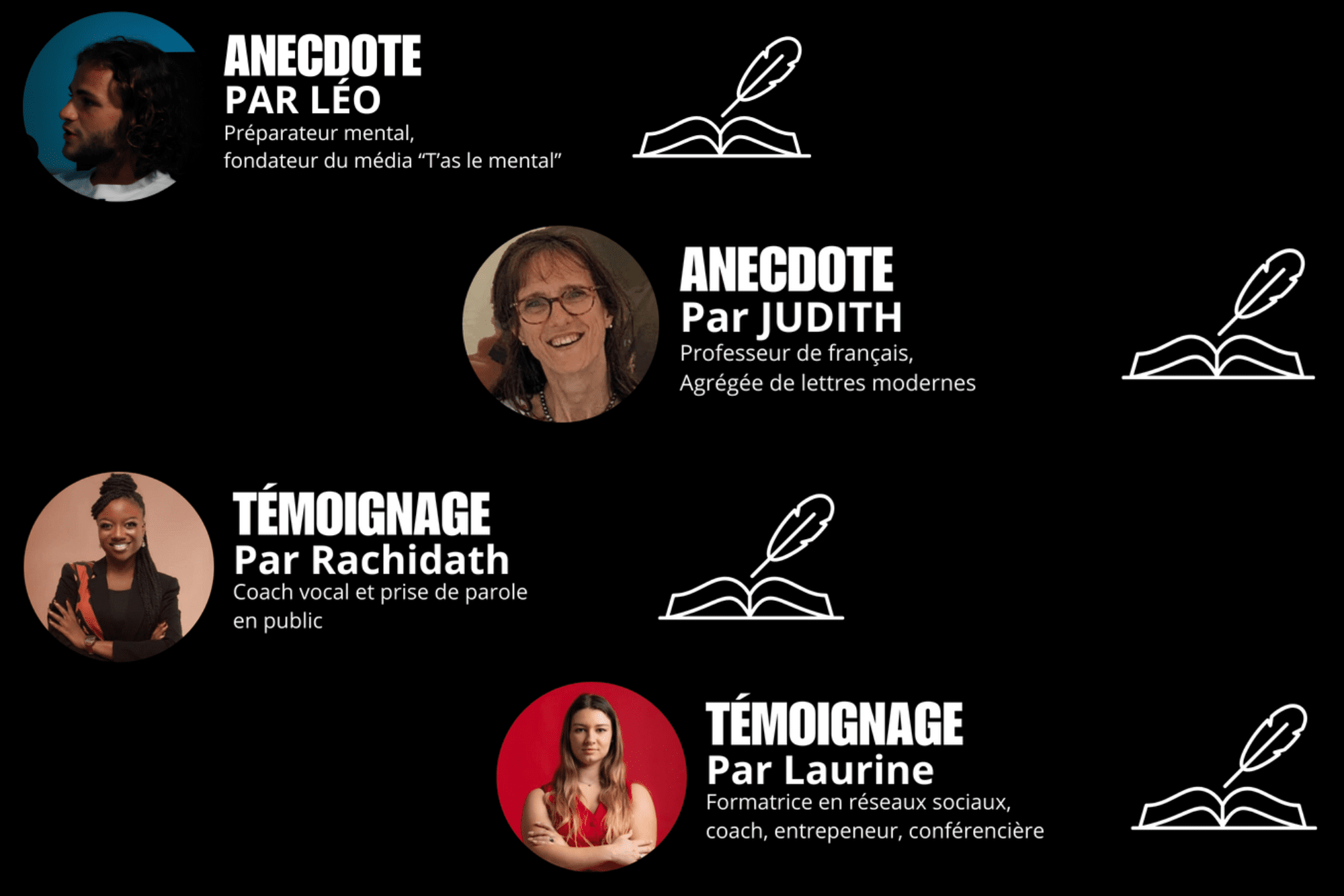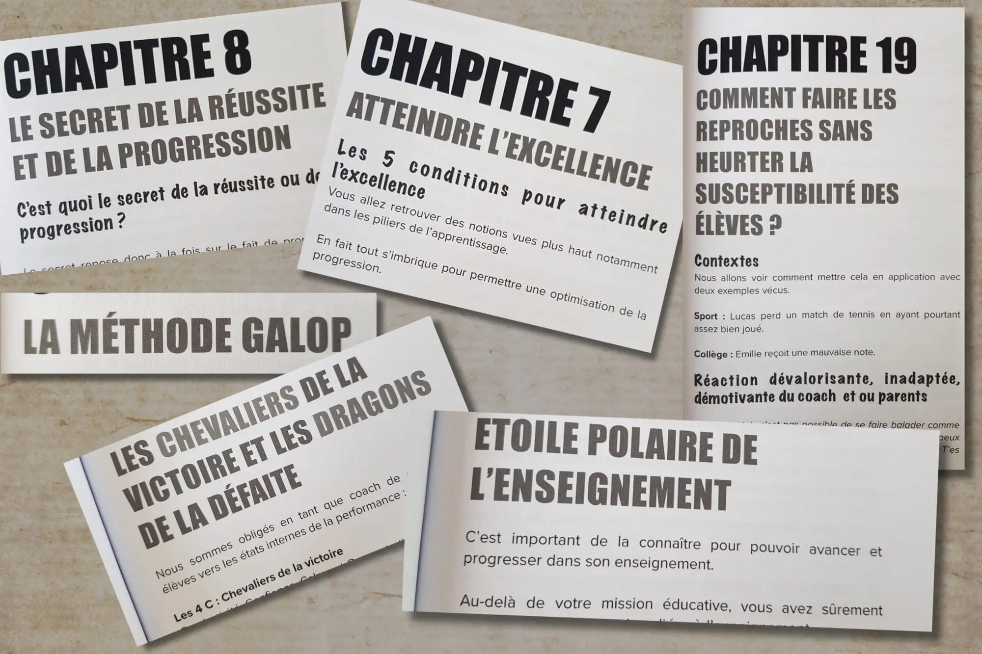 Aussi, 20 coachs de renommées issus de divers univers viennent aussi appuyer nos méthodes grâce à leur vision, leurs anecdotes.