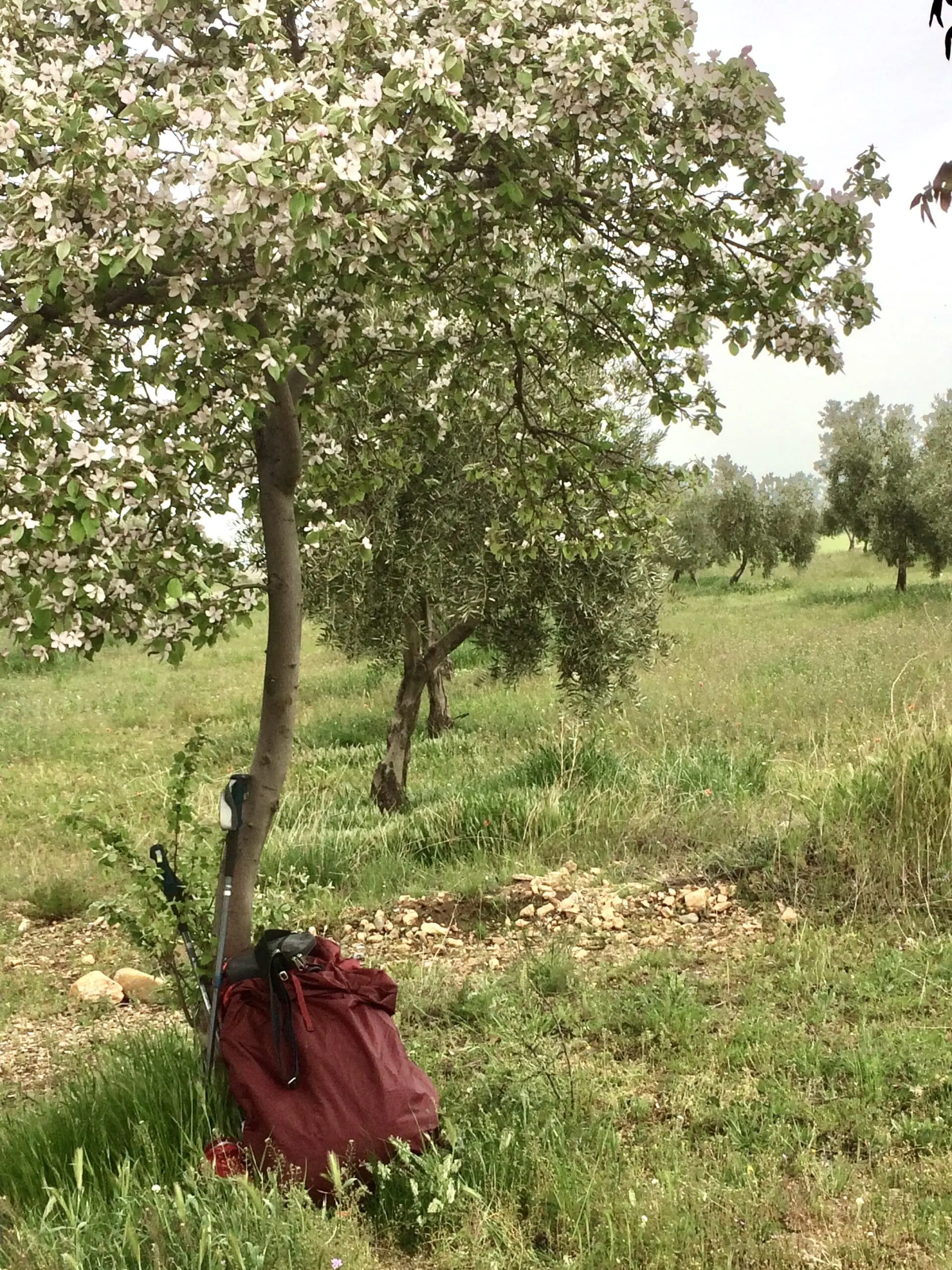 Non rien ! Je n’avais pas prévu. Il m’a toisée du regard, amusé, pas vraiment inquiet mais quand même. Il a hoché la tête en souriant, peut-être à cause de la couleur de mon sac à dos, de sa taille certainement. Gonflé il était, rempli de vêtements adaptés, de bricoles indispensables, pas une place de libre. Guide, trousse de toilette, onguents divers pour coups de mou et muscles fatigués côté droit, gourde, fruits secs et chocolat côté gauche. J’avais passé des heures à réfléchir au contenu de ce sac pour finalement au dernier moment rajouter des choses dont je craignais ne pas pouvoir me passer. Alors les bâtons de marche ? Un seul ? Deux ? Trop d’hésitations, je n’y avais plus pensé. Je me sentais solide, prête à partir.