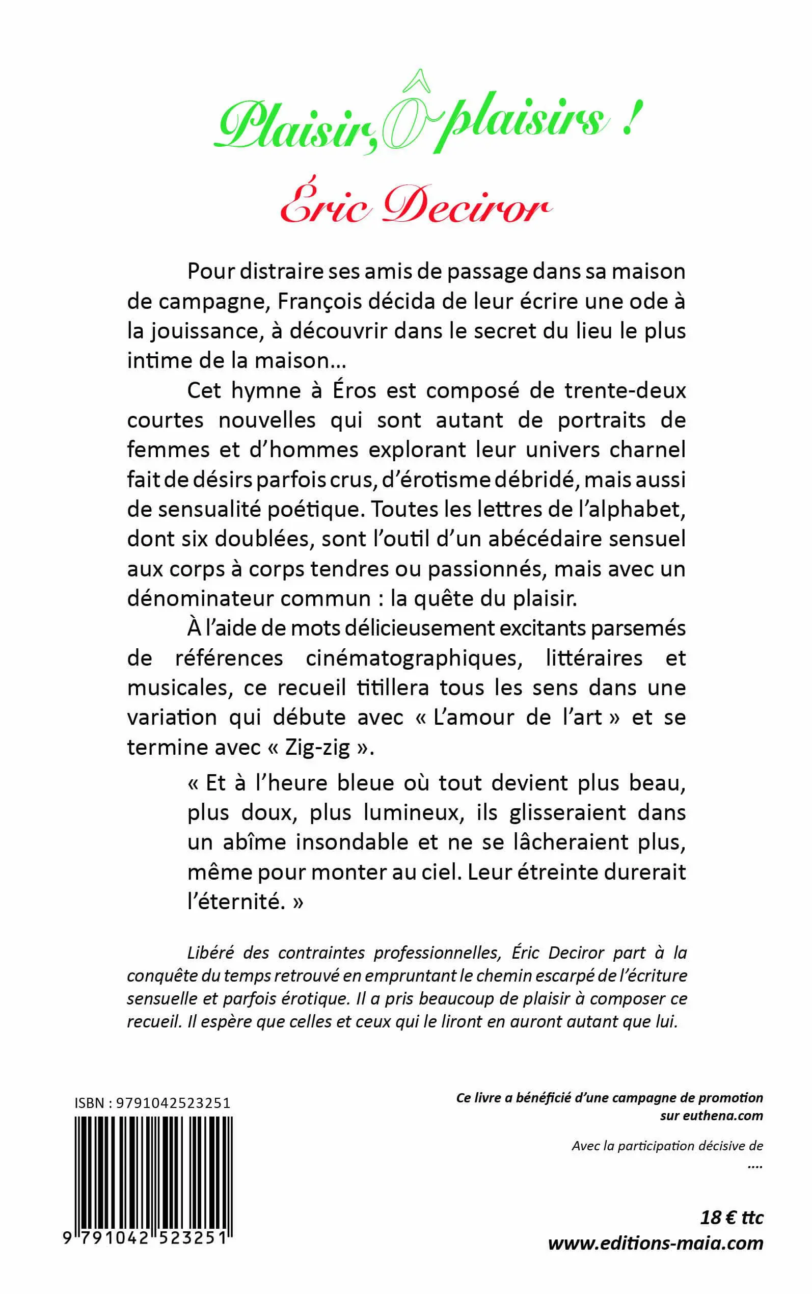 Cet hymne à Éros est constitué de 32 micro-nouvelles, autant de portraits de femmes et d’hommes explorant leur univers charnel, composé de désirs parfois crus, d’envies concupiscentes, d’érotisme débridé, mais aussi de sensualité poétique. À l’aide de mots délicieusement excitants, enrobés de références cinématographiques, littéraires et musicales, ce recueil souhaite titiller tous vos sens.