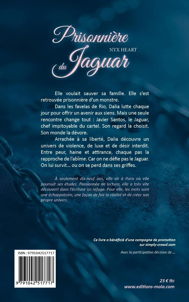 Je vous propose de participer à la création de mon livre “Prisonnière du Jaguar” en m’aidant à faire de sa parution prochaine avec les Éditions Maïa un succès, car pour moi, ce n’est pas qu’une simple romance : c’est une immersion dans un univers sombre, une aventure où chaque choix a des conséquences. C’est ce qui m’aide à fuir la réalité. En soutenant ce projet, vous aidez à donner vie à une histoire qui vous fera vibrer, frissonner et rêver, en retour, vous serez présent dans le livre à la page des remerciements et vous recevrez le livre en avant-première, frais de port inclus !