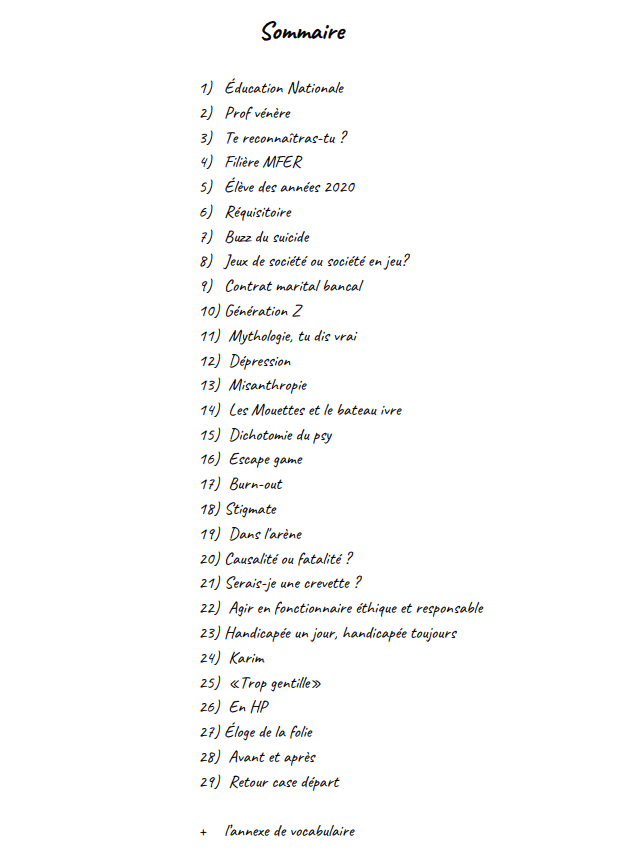 Ce livre se veut un témoignage de mon parcours personnel en tant que professeure ainsi qu’un réquisitoire contre l’Éducation Nationale. Je veux révéler au public la réalité du métier et surtout de son institution dont l’administration s’affranchit souvent de toute cohérence pour devenir un vaste cafouillis où l’économie demeure la seule règle. Je considère que ce sujet reste peu médiatisé où les exemples épars. Victime de ce système (le « mammouth » mal dégraissé, loin sans faut…), je lui porte un regard critique, parfois vengeur mais je l’espère, avec humour. Je regarde aussi mes élèves, la génération Z, avec tendresse, crainte et exaspération. Miroir de la société, ils m’inquiètent tout autant qu’ils amusent. Peut-être vais- je ainsi susciter le questionnement du lecteur ? C’est mon but. Je passe de l’échelle de la classe à celle de la société et tous les sujets y passent : l’éducation, la posture professorale, l’économie, l’écologie, la technologie, la pornographie… Au gré de mes réflexions et de mes péripéties, rythmées et dominées par les rimes, décalées par mes caricatures, j’aimerais emmener le lecteur, qu’il soit parent, élève ou professeur. Le divertir, l’amuser mais surtout le faire réfléchir.