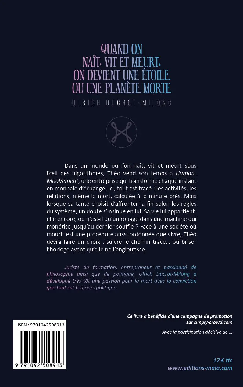 Dans un futur plus que probable, nous suivons le quotidien de Théo, jeune humain jouissant du bonheur que lui assure sa parfaite insertion dans un système social dont la principale fonction semble être une gestion fine du temps et des autres ressources et qui fonctionne grâce aux données partagées sur les réseaux sociaux. Grâce à des outils technologiques pensés pour presque chaque situation de la vie, Théo semble flotter sur un réel qui n’a que peu de prise sur lui, la mort elle-même étant prise en charge. Le récit accroche le lecteur grâce à un humour et un détachement qui ne sont qu’apparents : les situations, drôles ou absurdes, révèlent progressivement une toile de plus en plus étroite qui enserre les individus. Ce manuscrit aborde les thèmes de la mort et du cancer avec subtilité tout en emmenant le lecteur à méditer sur la société actuelle. Ainsi, ce livre met en exergue que la mort ne fait aucune différence et frappe tous les êtres vivants. Sans aborder la question de l’au-delà, la société décrite dans cet ouvrage place la mort au centre comme moteur de l’égalité réelle entre les citoyens. Son originalité réside dans le fait que la mort est envisagée positivement, ce destin commun rendant les citoyens empathiques. Participer à la création de ce roman c’est aussi promouvoir une autre vision de la vie, une vie où la mort n’est pas une fin mais un ciment fondateur car chaque personne que vous pouvez croiser dans la rue connaitra le même destin que vous. Ce manuscrit est une dystopie grinçante et le lecteur sera surpris de pouvoir télécharger l’application dont il est question dans le livre faisant ainsi passer de la fiction à la réalité.