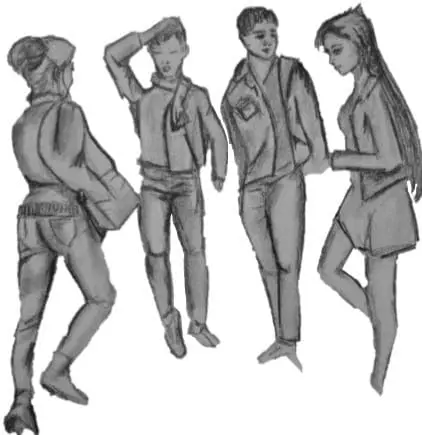 Frappés de stupéfaction, les quatre la regardent, immobiles, s’éloigner d’un pas vif en se dandinant, quand soudain elle se retourne vers eux :