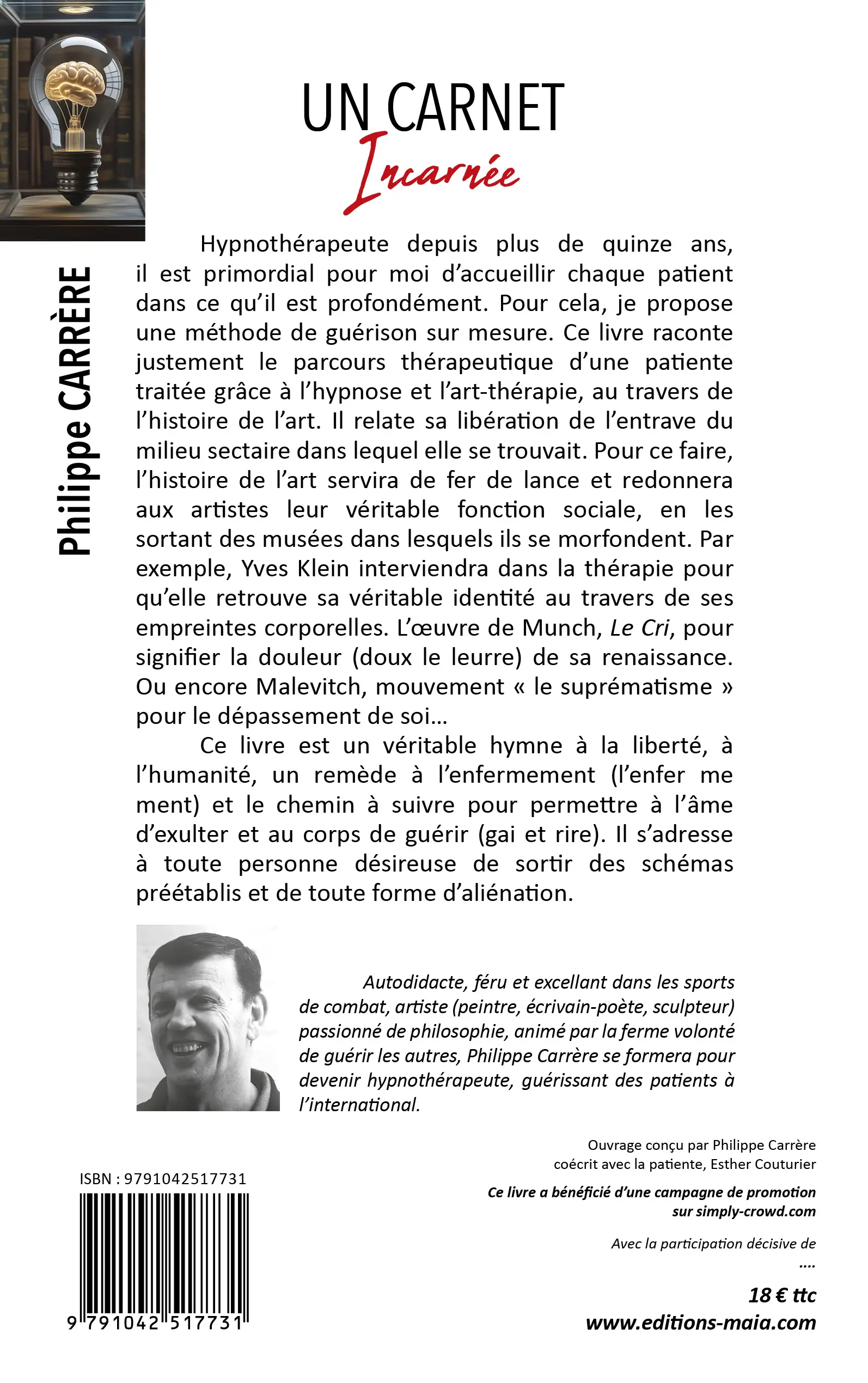 Hypnothérapeute depuis plus de 15 ans, il est primordial pour moi d’accueillir chaque patient dans ce qu’il est profondément. Pour cela, je propose une méthode de guérison sur mesure. Ce livre raconte justement le parcours thérapeutique d’une patiente traitée grâce à l’hypnose et l’art thérapie, au travers de l’histoire de l’art.