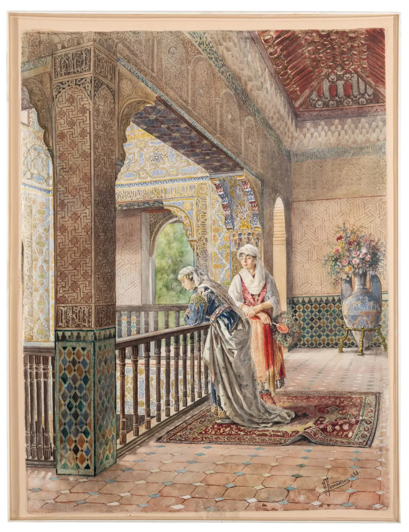 – Les courtisanes au balcon. Aquarelle sur papier. Amalio Fernandez (1859-1928). INU studio. Avec autorisation. 1884.