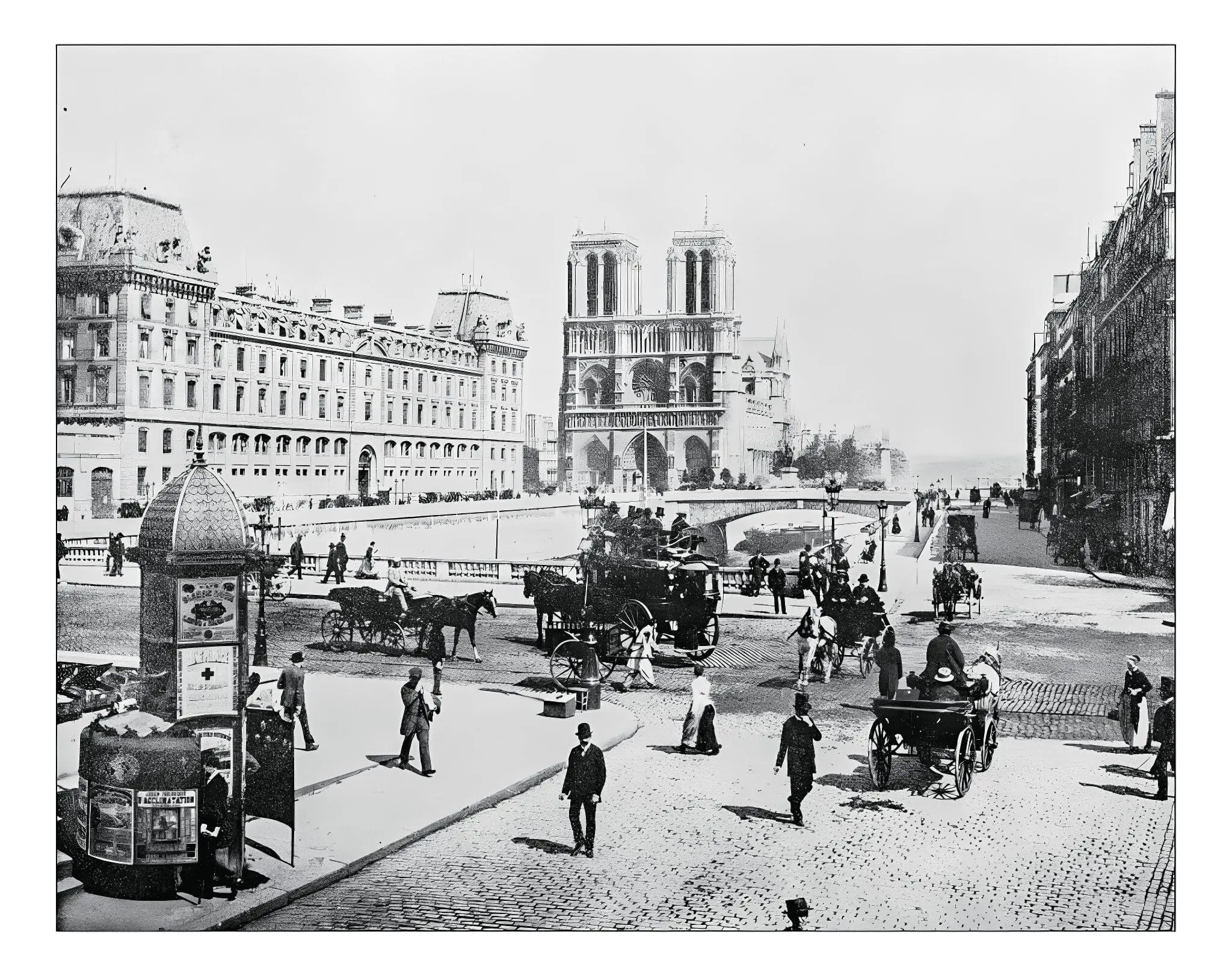 – Photo antique du XIXe siècle de Notre-Dame de Paris et ses alentours. Ilbusca. istockphoto.com. Licence standard. 15/06/2016. Image améliorée par l’intelligence artificielle sur vecticon.com. »