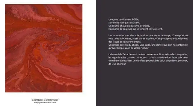 Son originalité repose sur l’association de deux formes d’art : la peinture acrylique d’une part, pour représenter de la manière la plus fidèle possible les perceptions colorées et les mouvements, et l’écriture poétique d’autre part, pour donner sens aux toiles présentées.