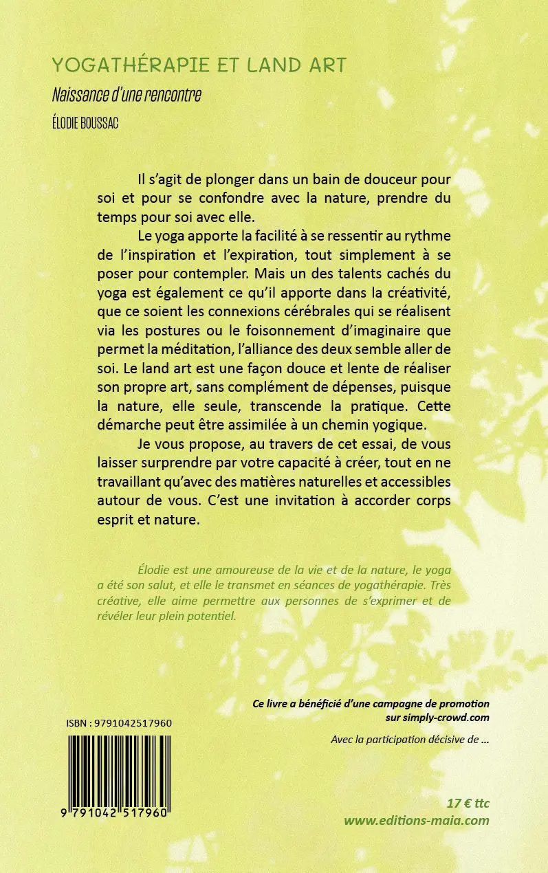 Cet essai est une bouteille à la mer à qui souhaitera explorer avec moi ces sensations, analyses et découvertes que j’ai pu réaliser en faisant le lien entre ma pratique naturelle de création dans et avec la nature et la yogathérapie, source de soin et de reliance à soi au travers des postures, respirations et enseignements du yoga.